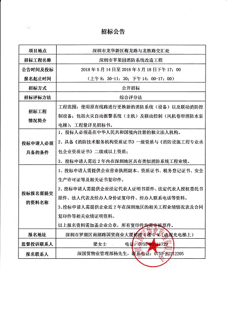 深圳市苹果园消防系统改造工程招标公告